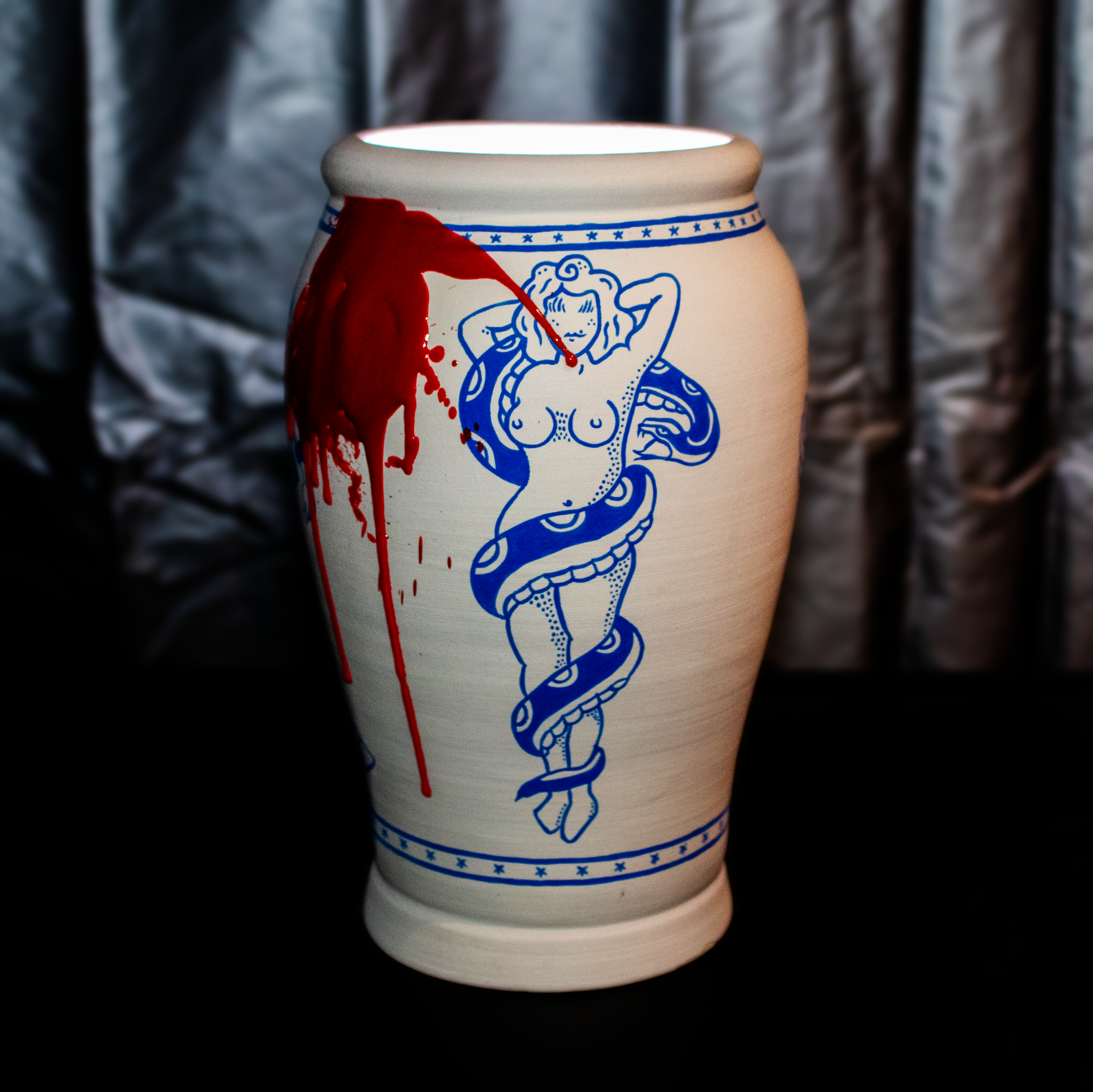 The pieces were installed in the LVK theater at the University of Oregon for my senior exhibition showcase. Using theater curtains, a tent, a spotlight, and a custom-built pedestal, I put this piece on display for hundreds of patrons at the University.